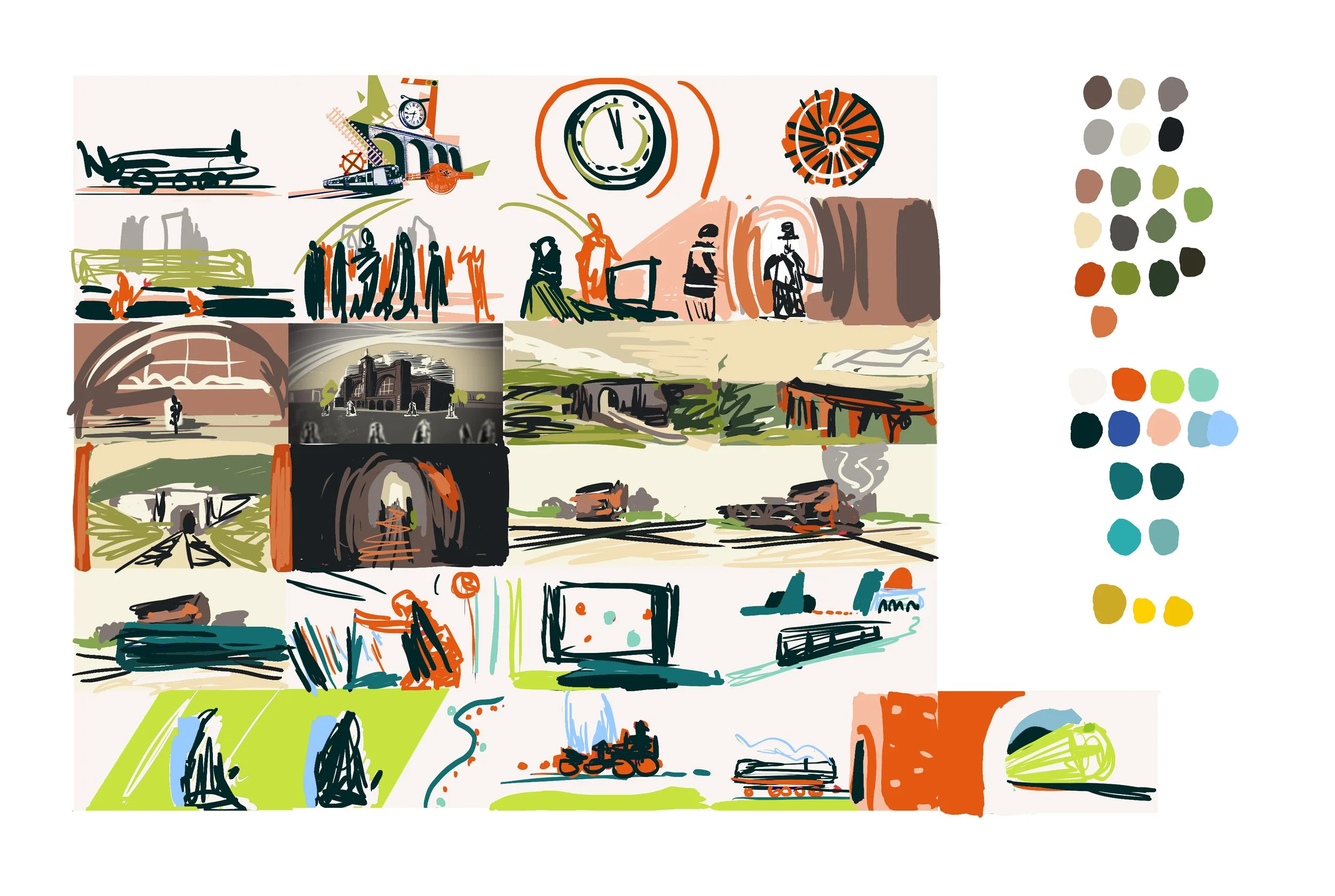 The historical side of things I felt would benefit from a digital, woodcut print illustration style. Whereas the modern sections could incorporate linework in a more minimalist, abstract type of way. The colour palette was to be more muted when we looked into the past, changing to bright pops of neon in the future.