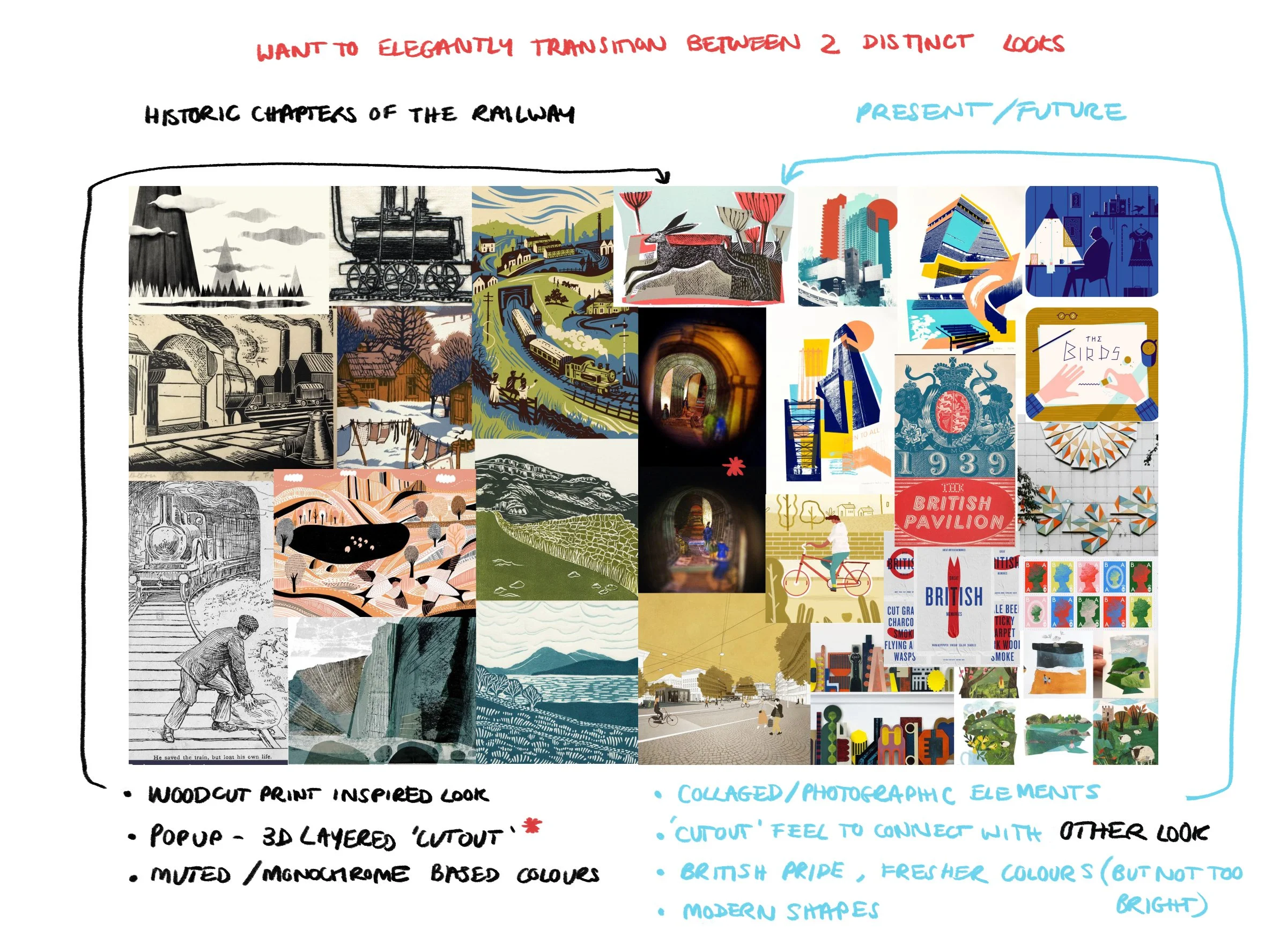 I also liked the idea of using collaged photographs and cutouts as I felt it connected the styles together in a “printed media” sort of way.