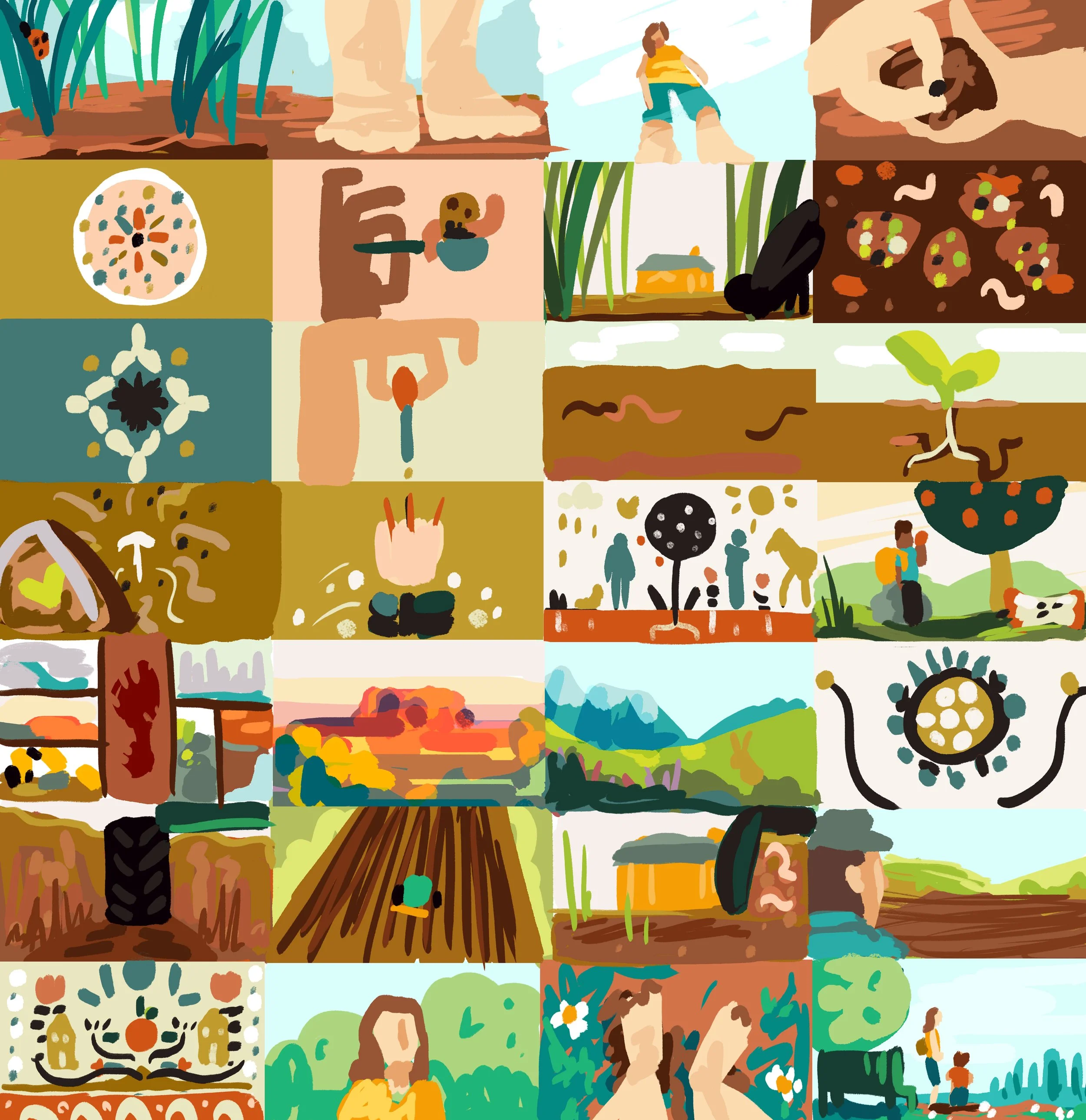 I explored a few different styles throughout the film, but it feels unified through the use of fun transitions. I wanted to use an earthy but colourful palette - and clean shapes with added texture. I tried to pair a very 2d, folky geometric animation style alongside scenes with more depth/interesting angles.